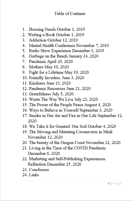 Collection of Blog writings 2019- 2020. Early days, the beginning of my blog writing. Started before the COVID pandemic, shows early thoughts about the pandemic, posts about writing and marketing experiences, environmental issues, health and mental health including addiction. A story on Mothers. The book contains 22 chapters.