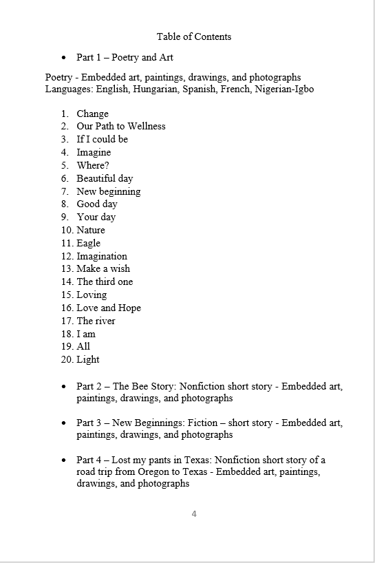 Poems in multiple languages, art, 3 fun short stories and audio files of each chapter